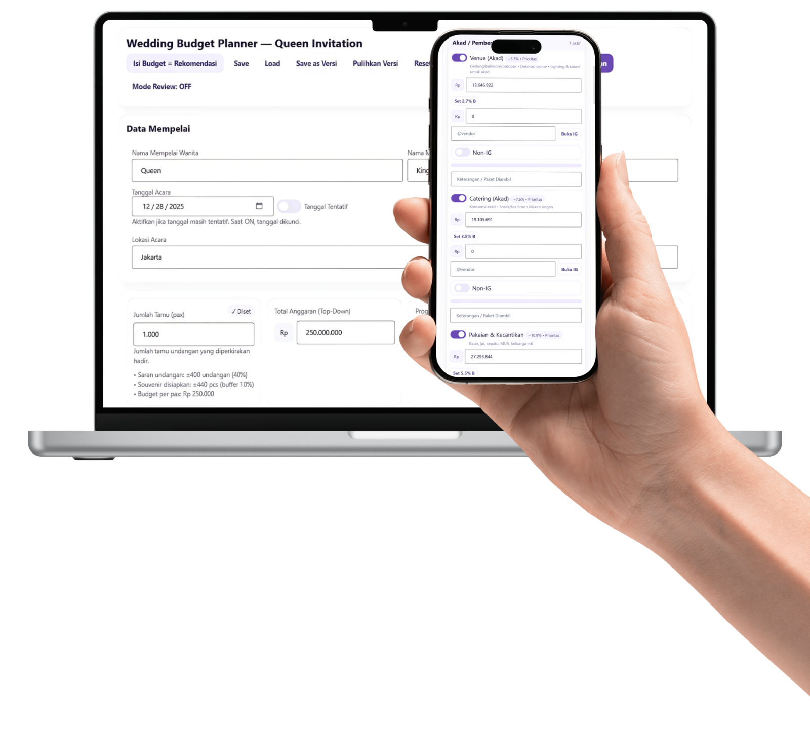 Atur anggaran, timeline, dan detail pernikahanmu dengan mudah bersama Queen Invitation. Praktis, profesional, dan membantu wujudkan hari istimewamu tanpa ribet.